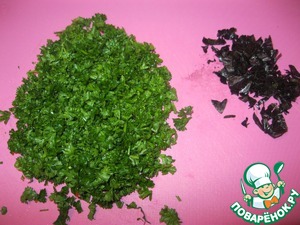 Петрушку и базилик измельчить. Часть петрушки оставить для украшения готового блюда