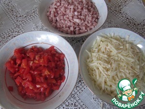 Ветчину и помидорчики нарезать мелким кубиком. Помидоры отжать от лишнего сока. Сыр натереть на крупной терке.