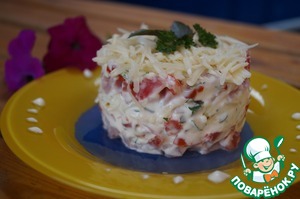 Салат сложить слоями: ветчина, помидор, сыр. Каждый слой полить майонезно - чесночной заправкой. Этот салат можно сразу подавать к столу. Я сделала порционную подачу, но можно и в большом салатнике.