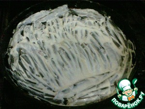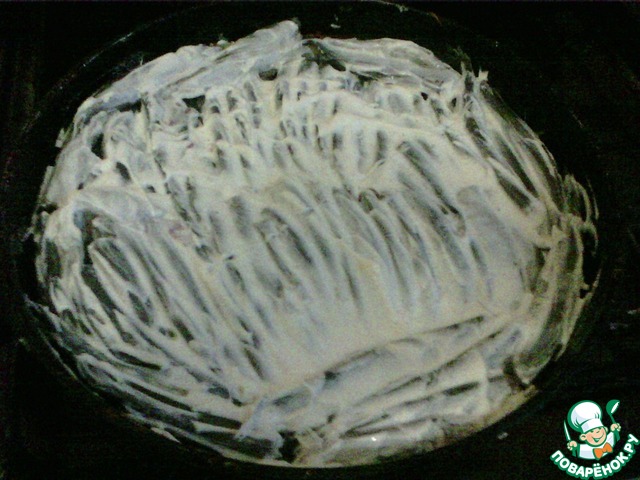 • Сверху разложить в один ряд мойву плотно друг к другу, солим-перчим по вкусу. Я заранее у рыбы отрезала головы, выпотрошила, вынула хребет.