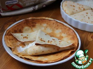 • Для заливки смешать немного молока 70-100 мл с 1/2 яйца и 1 ч. л. сахара. Равномерно залить блинчики и поставить запекаться при температуре 160-170 градусов на 25-30 минут.