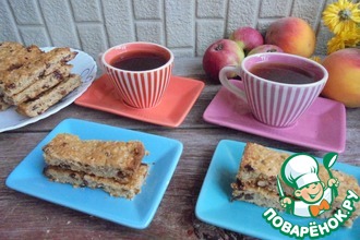 Достаем из духовки, посыпаем оставшимся "песочно-злаковым" порошком, разрезаем на батончики и даем остыть.