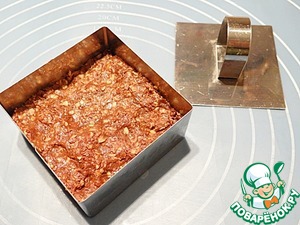 Далее использую кулинарную форму "квадрат" с крышкой-прессом 8*8 см. Выкладываю в нее 1/4 часть шоколадной массы, прижимаю крышкой.