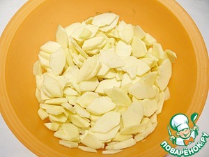 Готовлю яблочный слой. Яблоки мою, очищаю от кожуры и семян, нарезаю ломтиками.