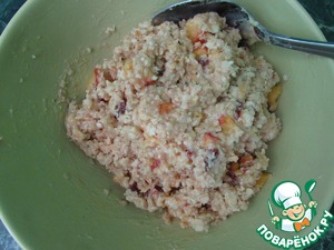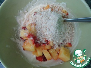 Добавить в шоколад порезанные небольшими кубиками персик, клубнику и измельчённые на небольшие кусочки орехи