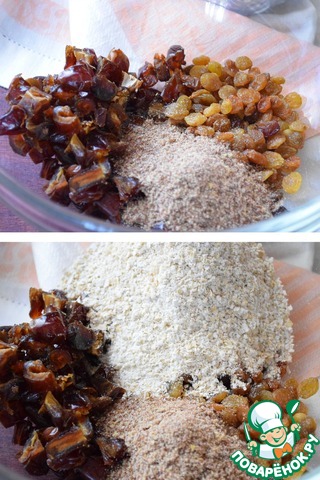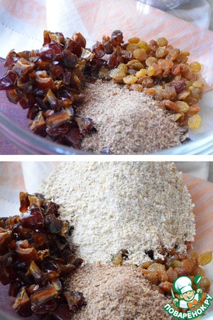 В глубокую миску выложить промытый и хорошо просушенный изюм, порезанные финики, перемолотые хлопья и орехи.