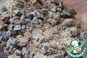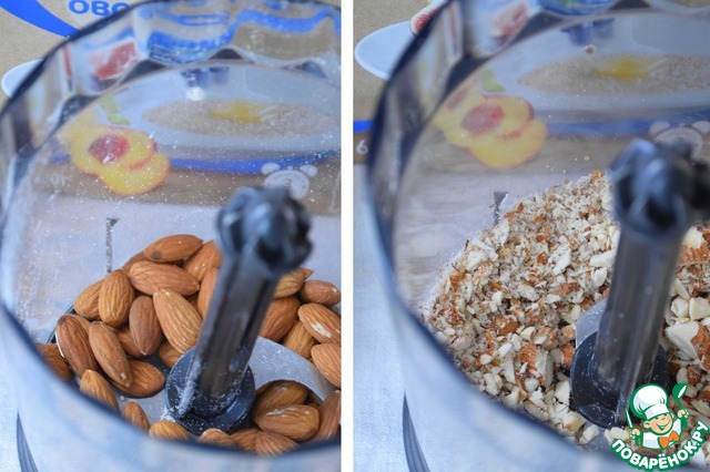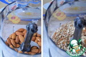 Орехи также измельчить в блендере, но не в крошку, а чтобы остались средние кусочки.