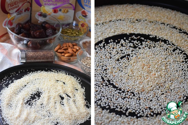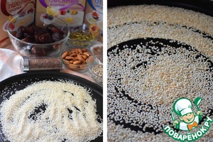 Кунжут обжарить до приятного золотистого цвета: я обжаривала в микроволновке в режиме "Аэро" при температуре 210°С 8 минут.