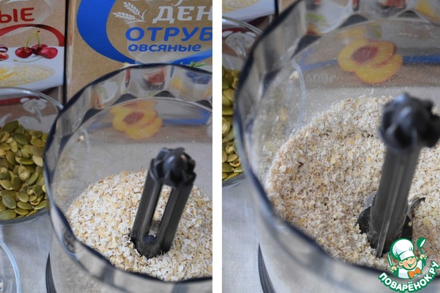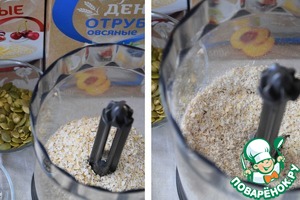 Все отруби и 1/2 стакана овсяных хлопьев с отрубями измельчить в блендере (или пропустить через мясорубку)