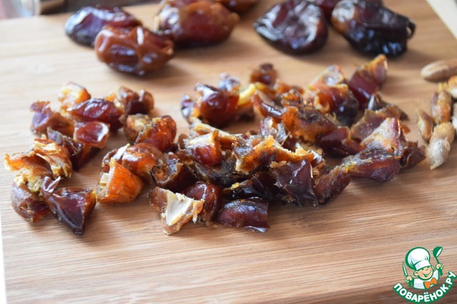 Финики освободить от косточек и порезать кусочками.