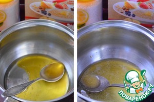 В ковшик вылить подсолнечное масло, добавить мед и соль. На медленном огне, постоянно помешивая, довести смесь до кипения и отключить.