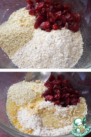 В большую миску выложить перемолотые орехи, хлопья, кунжут и клюкву. Вылить вышеприготовленную смесь и хорошо перемешать.