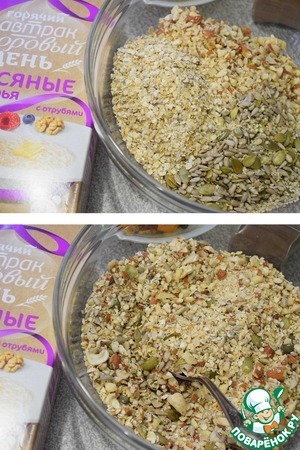 В глубокую миску выложить хлопья, перемолотые орехи, семечки, кунжут и хорошо перемешать.