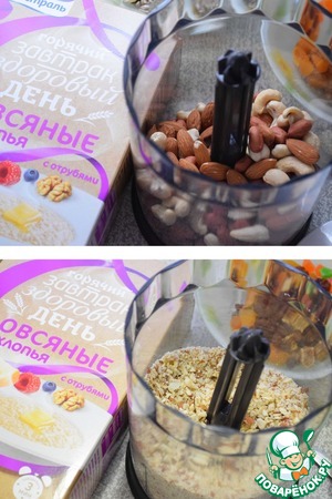В глубокой миске смешиваем поджаренную смесь с сухофруктами, цукатами и сиропом.