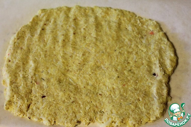 На пергаменте раскатать тесто, толщиной 3-4 мм, в форме прямоугольника.