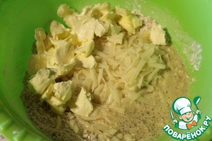 Добавить натертый на крупной терке сыр, размягченное сливочное масло и светлое пиво. Тщательно все перемешать и замесить тесто.