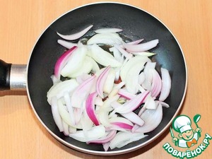 Выложить в чесночное масло крупно нарезанный репчатый лук.