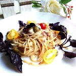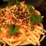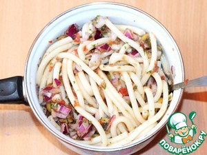 В переводе с итальянского «bucato» означает дырявый. Эта длинная паста внешне похожа на соломинку. Идеальным соусом к букатини считается аматричиана с корейкой и помидорами. Хотя с другими соусами она не менее вкусная. У меня овощной соус, но очень вкусный.