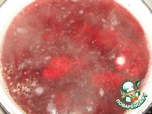 • В сварившийся бульон добавляем свеклу. Можно добавить сразу каплю уксуса - тогда свекла не потеряет цвет.
