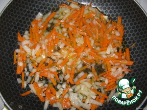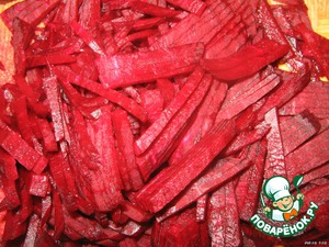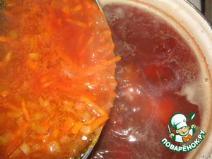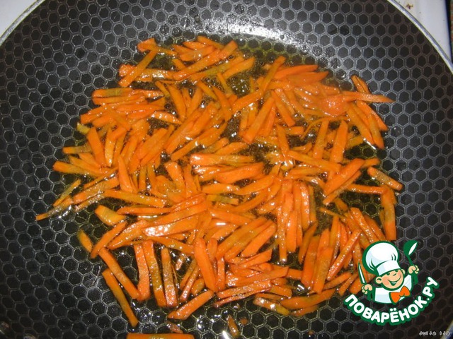 • Пока свекла варится делаем зажарку: морковь, нарезанную соломкой обжариваем на растительном масле.