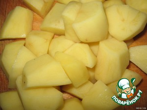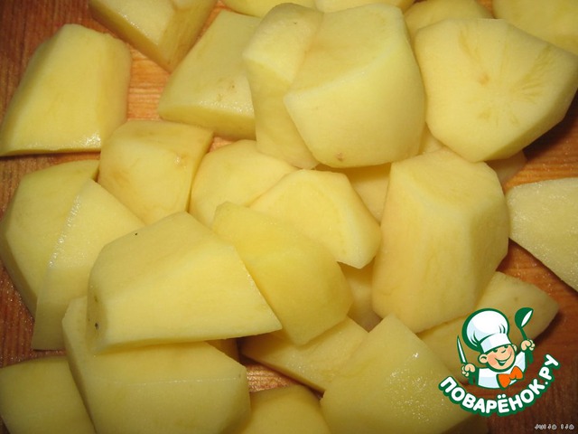 • Нарезаем картофель, довольно крупными кусками. Может быть кто-то любит помельче, но мы любим именно так. Добавляем его в бульон со свеклой, но только когда свекла полностью сварилась.