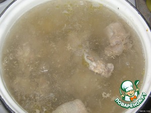 • Варим бульон. Мясо лучше брать с костью, тогда бульон будет насыщеннее. Готовый бульон солим по вкусу.