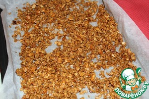 Выкладываем получившуюся смесь на противень, застеленный пекарской бумагой и отправляем в духовку, предварительно нагретую до 180 град. на 20 минут. Не забываем перемешивать смесь каждые 7- 10 минут. После того как овсяно-ореховая смесь приобретет золотистую блестящую поверхность, противень достаем из духовки и даем смеси остыть. Остывшую смесь немного разминаем руками.