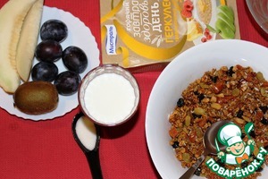 Хлопья "Геркулес" от компании "Мистраль" очень подходят для приготовления хрустящего мюсли (гранола), а уж дальнейшая судьба мюсли в ваших руках. Можно взять для перекуса на работу, учебу; залить молоком, кефиром, ряженкой, соком или йогуртом. Я предлагаю, используя мюсли и фрукты, приготовить фруктовый салат, который порадует и вас и ваших гостей.