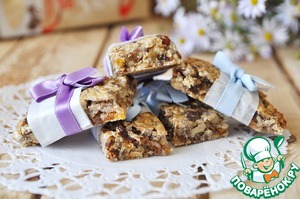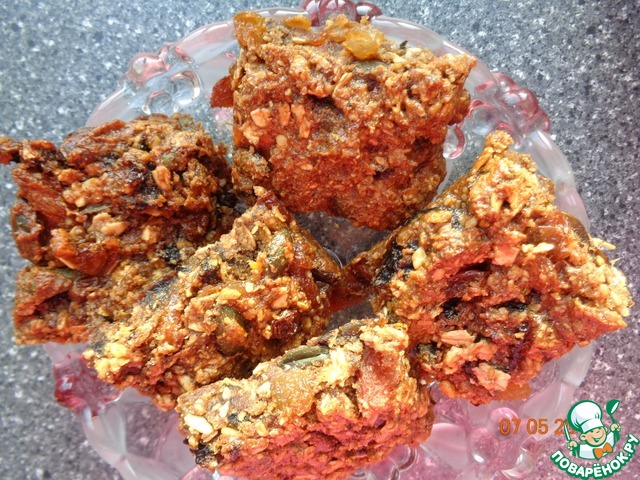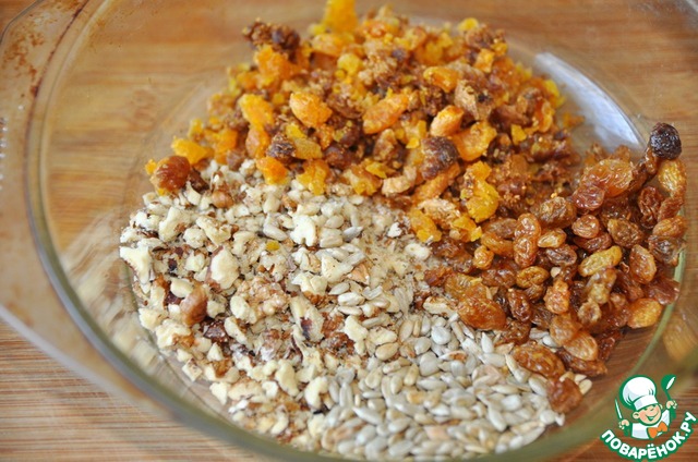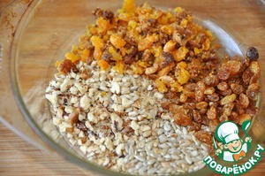 Придумываю новые варианты. Делюсь впечатлениями и информацией. Попробовала такой состав сухофруктов: инжир, курага, чернослив, орехи - фундук и немного домашних цукатов из корочек помело. Добавила порошок горячего шоколада. Не использовала изюм и семечки.