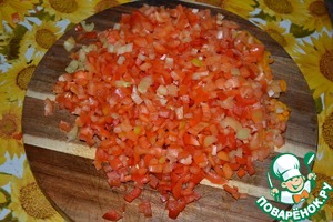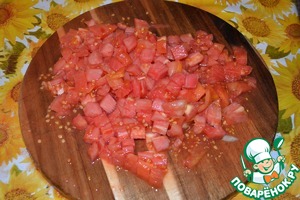 Помидоры обдаем кипятком, снимаем кожицу и режем крупненькими кубиками.
