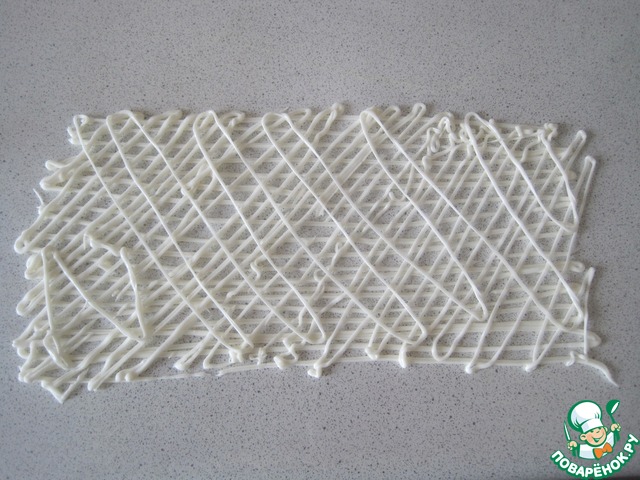 Чтобы завершить шоколадную тему, готовим украшения из белого шоколада. Растапливаем белый шоколад в микроволновке. Отсаживаем сеточку на пленке