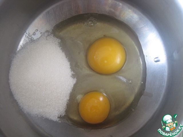 Пока шоколад растапливается яйца соединяем с сахаром, подогреваем до 40*
