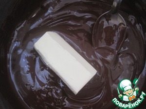 К растопленному шоколаду добавляем сливочное масло, перемешиваем