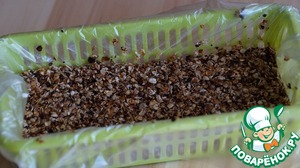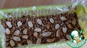 На медово-овсяную массу выкладываем обжареный и очищенный арахис (половину от всего количества), хорошо вдавливая его в основу.