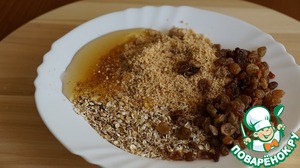 • Соединяем отжатый изюм (воду сохранить), арахис, овсяные хлопья и мед.