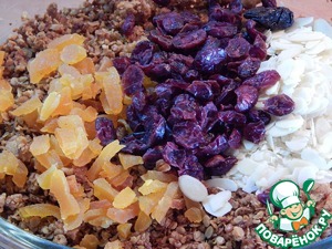 В готовую поджаренную (остуженную) смесь выкладываем клюкву, курагу и миндальные лепести (слегка обжаренные). Перемешиваем.