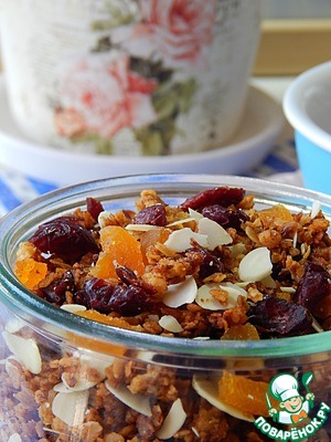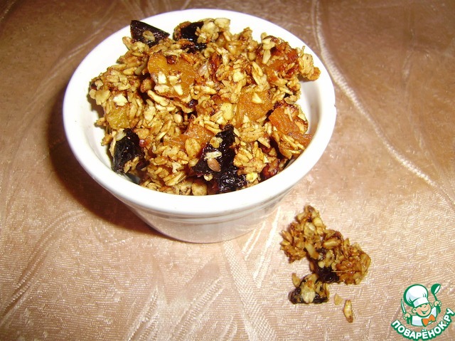 Предлагаю рецепт вкусной гранолы. Несколько ложек этой питательной смеси с молоком или йогуртом на завтрак подарят заряд бодрости и хорошего настроения на весь день. Попробуйте!