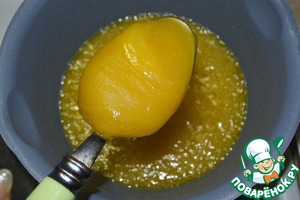 Добавить мед, довести до кипения, убавить огонь и дать покипеть, минут 7. Чтобы определить готовность сиропа, опустите каплю в ледяную воду. Нам нужна консистенция "мягкий шарик"! Не передержите!