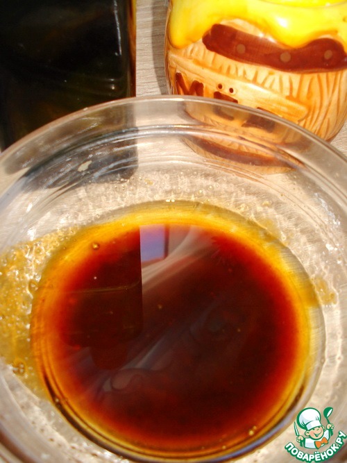 • В другой миске смешайте растопленное сливочное масло, оливковое масло и мед. ( у меня такой темный, потому-что мед гречишный).