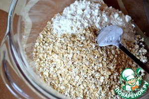 • В миску высыпаем хлопья и кладем муку, сахар, перемешиваем