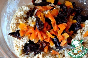 • Кладем в миску кунжут, корицу, воду, нарезанные чернослив и курагу, все перемешиваем