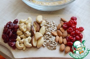 • 4. В хлопья добавить орехи и цукаты. Крупные орехи можно слегка измельчить.
