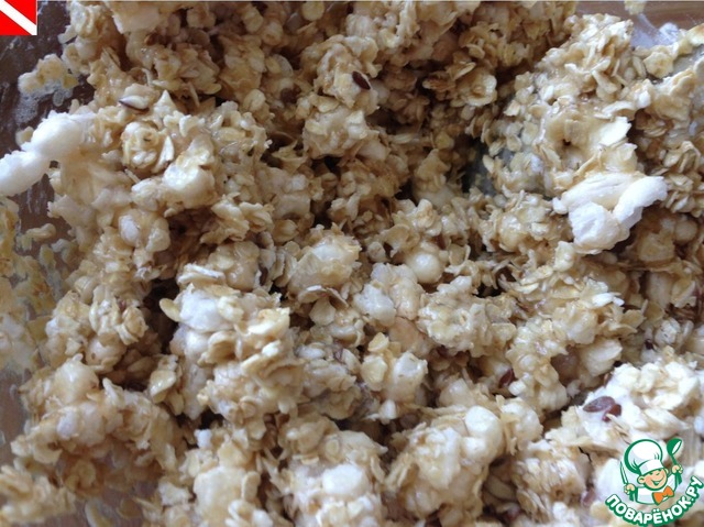 • Размешиваем, добавляем хлопья, воздушный рис, ваниль и соль.