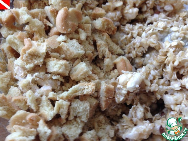 • Еще раз размешиваем. Теперь очередь печенья. В оригинале, конечно, используются graham crackers (это как сладкие крекеры, более рассыпчатое и нежное, чем "Юбилейное"). Но за неимением оных я использую "Юбилейное". Печенье немного измельчаем и добавляем в нашу массу. Перемешиваем, добавляем оставшийся маршмеллоу и шоколад. К этому времени масса уже достаточно остыла, чтобы шоколад не растаял.