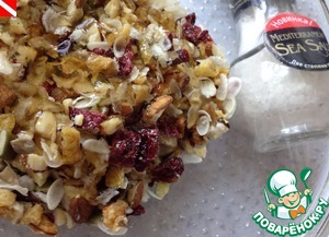 Смешиваем орехи и ягоды вместе - в общей сложности должно получиться чуть больше стакана. Всыпаем рисовые хлопья.