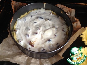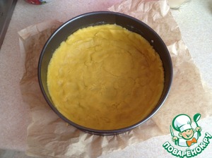 Форму для выпечки застилаем пергаментом, а бочка смазываем маслом чтобы легче потом вынуть пирог. Равномерно распределяем тесто по дну формы и делаем бортики пальца на три высотой.