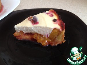 Смешиваем перетертый через сито творог, яичные белки, крахмал и сгущенку. Все это перемешиваем миксером или блендером и заливаем начинкой сливы.