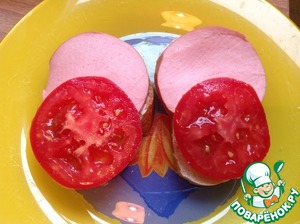 Сверху выложить кусочек вышей любимой колбасы и кружочек помидора