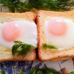 Яйцо разбить и аккуратно выложить в отверстие. Подсолить и отправить на 5 мин. бутерброды в СВЧ при мощности 800 ватт. Готовый бутерброд украсить веточкой укропа