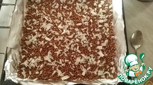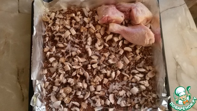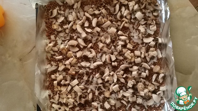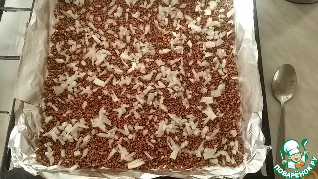 Берем гречку, промываем, сливаем воду, выкладываем на противень (предварительно застелив его фольгой), посыпаем резаным лучком